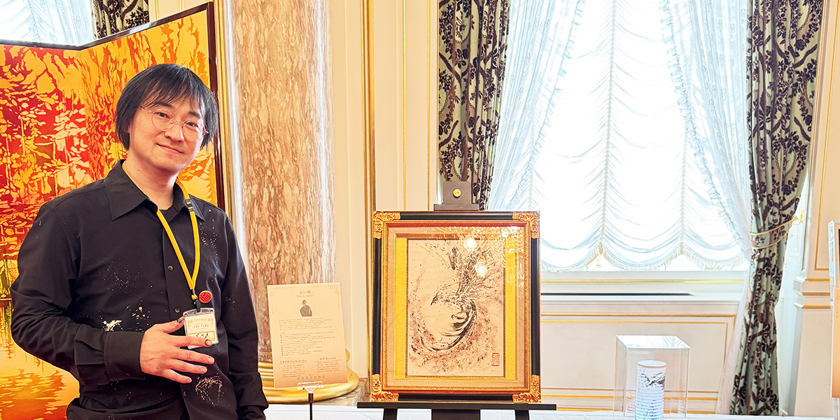 Arakawa Kaoru’s ink-brush work “Suzaku Ranbu” and his collaborative piece with Wataya Zenbei, “Ryuso,” are on display in the VIP Room, Asahi no Ma.